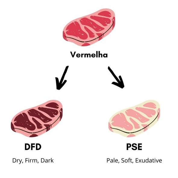 Carne DFD (dark, firm, dry) – carne escura, firme, seca, é uma carne de baixo período de conservação, não recomenda para industrialização, está é decorrente de estresse crônico no pré-abate, o músculo irá gastar o glicogênio antes do abate (reserva de energia), promovendo valores elevados de ácido lático na carcaça, qual terá um pH alto, que por consequência ocorrerá ação de microrganismos, que por sua vez, irão impacto na conservação do produto final, tendo menor vida de prateleira.